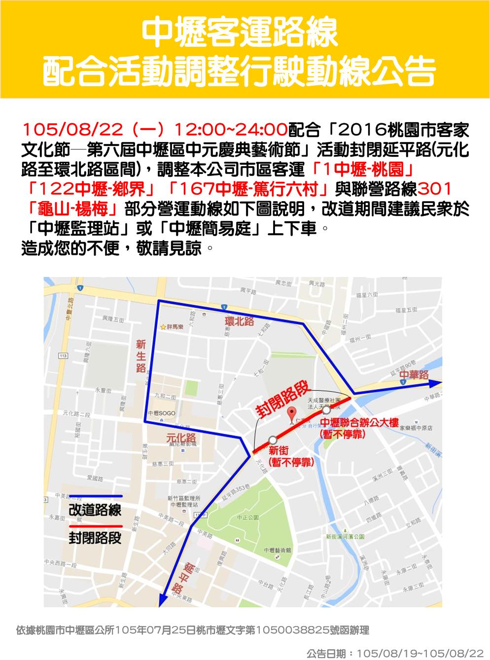105/8/22 12:00-24:00配合第六屆中壢區中元慶典藝術節改道公告
