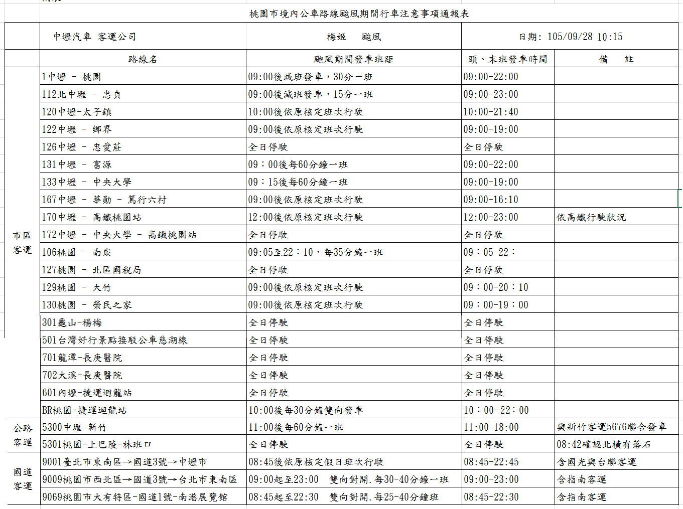 9/28受梅姬颱風影響服務異動公告(10:30更新)