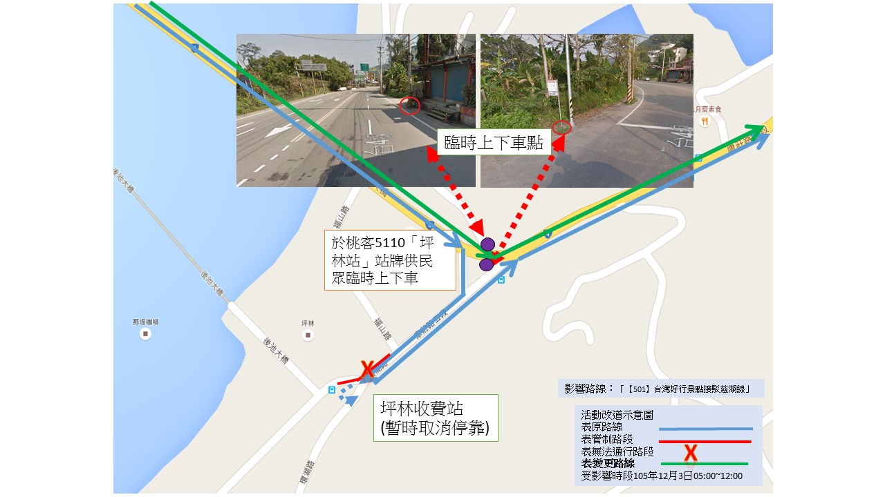 1.依據桃園市政府交通局105年11月18日桃交公字第1050042445號函辦理。 2.影響時間:105年12月03日 05:00-12:00 3.「坪林收費站」因封閉取消停靠,改設「坪林」站為臨時上下車站。