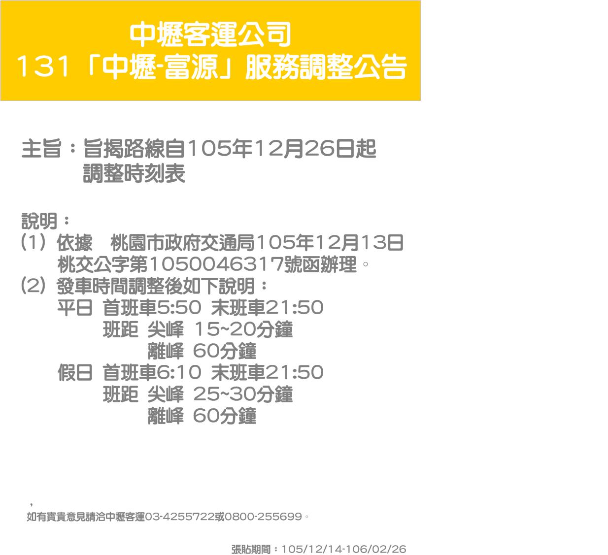 105/12/26起,131「中壢-富源」調整時刻表公告