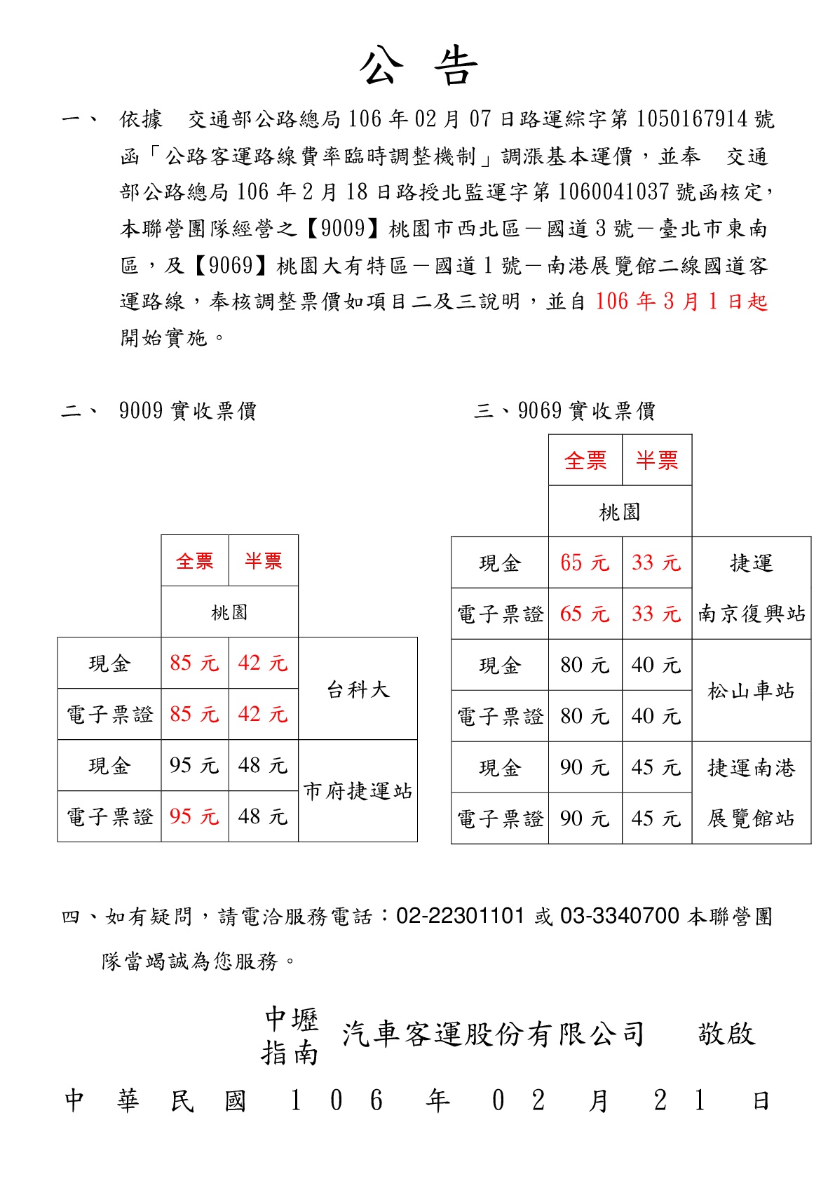 國道9009與9069路線自106年3月1日起調整票價公告
