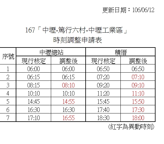 167「中壢-篤行六村-中壢工業區」106年07月01日調整時刻