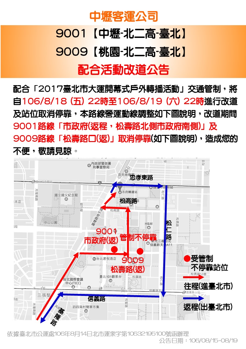 9001與9009國道客運路106/8/18~8/19線配合活動改道公告